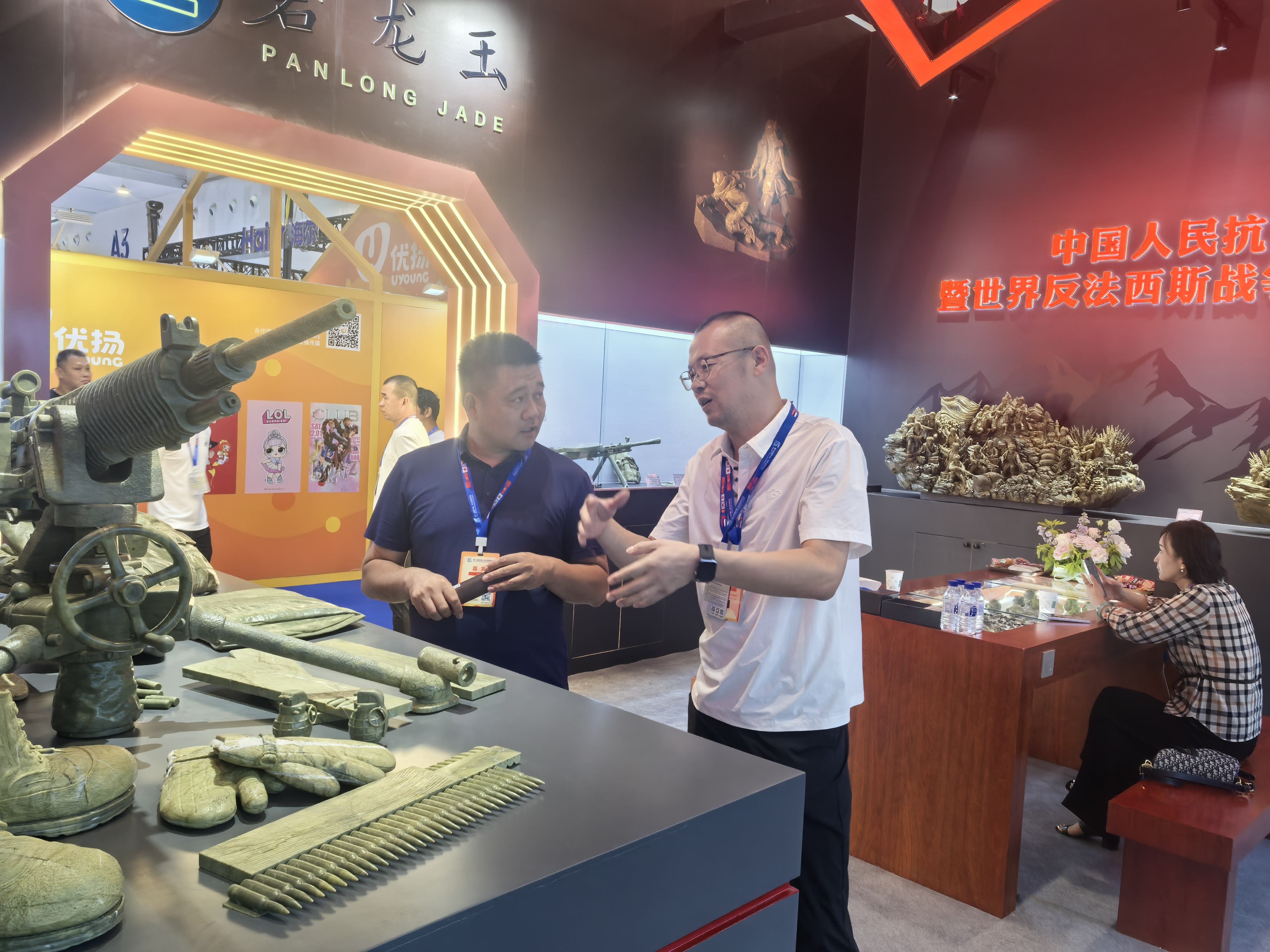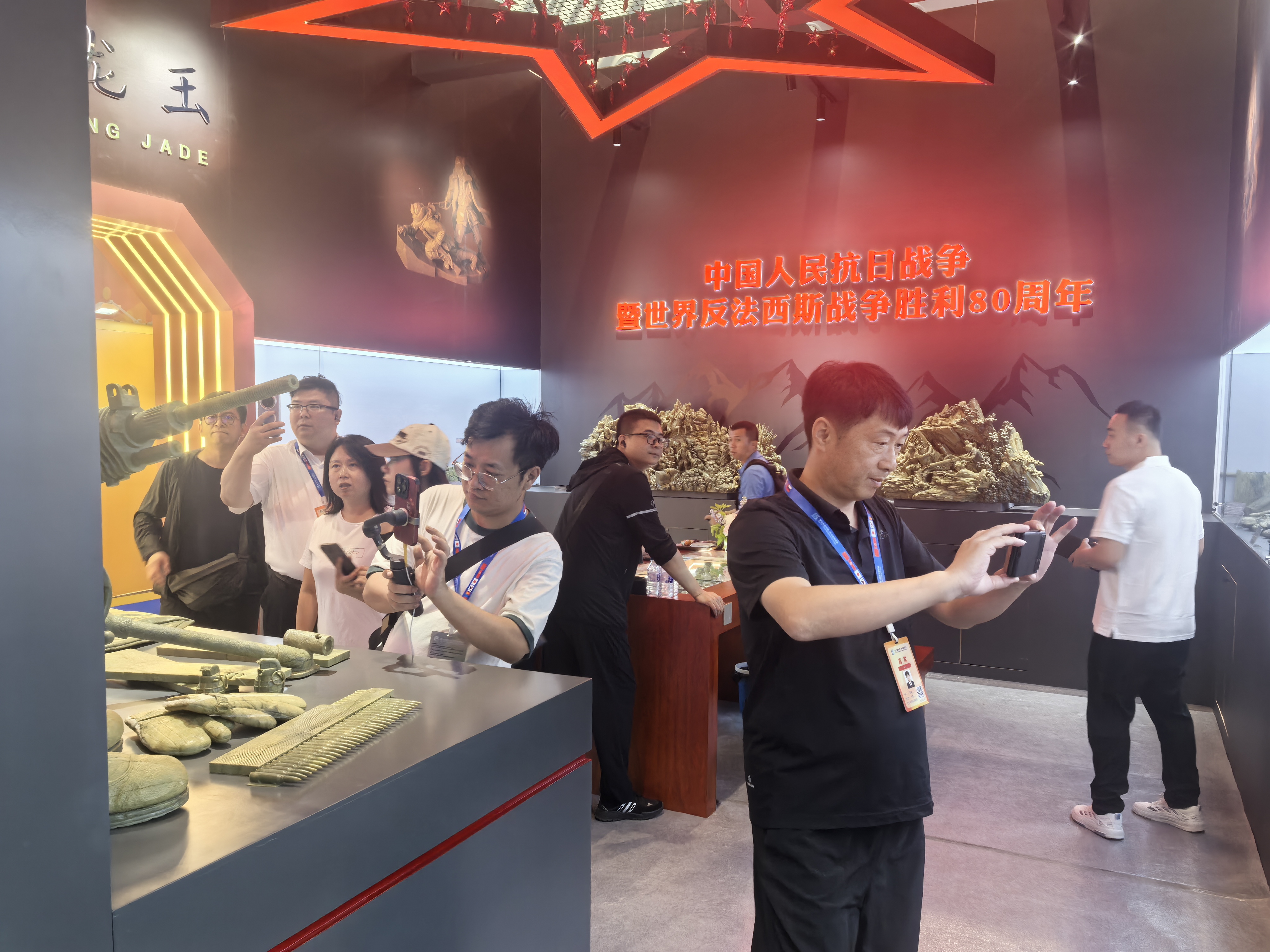 本次展位设有抗联军械区、抗联物资区、抗联场景区、疗愈康养区四个区域,共展示100余件玉雕作品。其中,抗联区的重机枪组合、坦克及手榴弹等作品,充分展现了磐龙玉玉雕的深厚文化底蕴与精湛技艺,受到多家媒体的重点关注。多位相关领导嘉宾也莅临现场,与负责人深入交流,了解作品背后的创作历程。疗愈康养区展出的玉镯、玉佩、玉梳等,打破了传统认知壁垒,向各国嘉宾展示了矿物药资源与现代健康理念的创新融合。