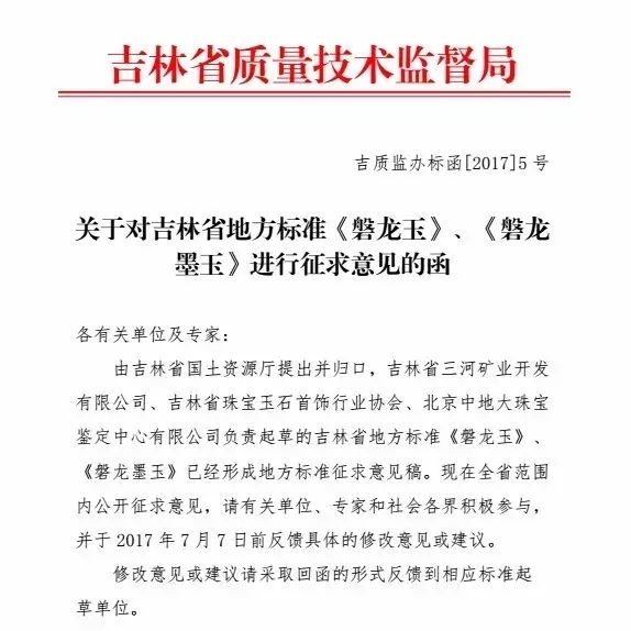 磐龙玉丨关于对吉林省地方标准《磐龙玉》、《磐龙墨玉》进行征求意见的通知!